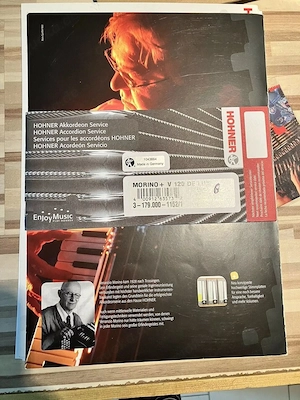 Modell: Hohner Morino+ IV 120 De Luxe TECHNISCHE DATEN: Klaviertasten: 41 Anzahl der Töne: 41, F - A Gattung: chromatisch Chöre: 5 Anzahl der Register: 13 Klangfarben: 13 Chöre im Cassotto: 2 Füsse im Cassotto: 16' + 8' Standardbässe: 120 Standardbasschöre: 5 Standardbassregister: 7 Größe: 49 cm x ...