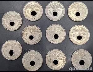 biete hier 10 historische 2-Reichsmark-Münzen aus Silber (0,625 Feinheit) an. Die Münzen stammen aus den Jahren 1937 bis 1939 und zeigen auf der Vorderseite Paul von Hindenburg und auf der Rückseite den Reichsadler.Die Münzen sind in gebrauchtem, aber solidem Zustand mit Gebrauchsspuren, Patina und ...
