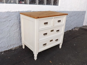 Kleine Wäschekommode aus nachhaltigem, massivem Weichholz. Weiß überstrichener Korpus in Pfostenbauweise; hohe, gedrechselte Füße. Erneuerte, wasserabweisend frisch geölte Platte im Naturton, vier leichtgängige, innen sauber geschliffene Schubladen; Messingbeschläge. Patina- und Gebrauchspuren: siehe ...