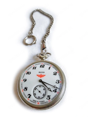 Schöne Eisenbahnertaschenuhr von dem russischen Hersteller "Molnija" mit Kette. Die Taschenuhr befindet sich noch in einem top Zustand. Voll funktionsfähig. Eigenschaften: - Stahlgehäuse mit Muster (Dampflok); - Weißes Zifferblatt mit großen schwarzen, und kleineren roten Zahlen; - Kleine Sekundenanzeige ...