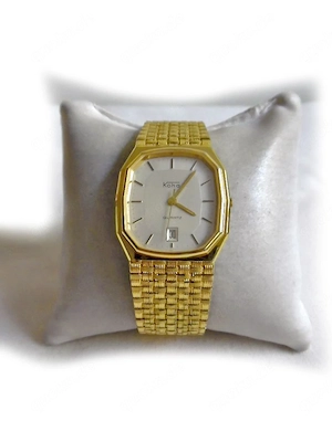 Seltene Armbanduhr von dem deutschen Hersteller "Koha". Die Uhr befindet sich noch in einem sehr guten gebrauchten Zustand. Voll funktionsfähig. Eigenschaften: Gehäuse: Stahl, vergoldet, LXB = 34X32 mm. Band: Original Stahlarmband mit einem Clipverschluss. Zifferblatt: Weiß, mit großen Zahlen, ...