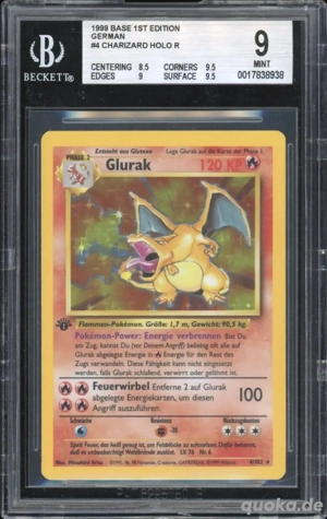 Zum Verkauf steht eine (1) BGS 9 Glurak (Glurak) Karte aus der 1. Auflage des deutschen Basis-Sets. Die Karte wird im Ist-Zustand verkauft. Scans der Karte, die Sie erhalten.