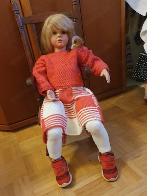 Zum Verkauf steht eine Porzellanpuppe (Größe 72 cm). Die Puppe hat Porzellanarme und -beine und einen weichen Körper. Sie hat eine Echthaarperücke, mundgeblasenen Glasaugen und echte Wimpern. (Der Schaukelstuhl kann mitgeliefert werden). Die Puppe kann nur sitzen bzw. auf dem Schaukelstuhl sitzen. Die ...