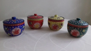 4 Gefäße mit Deckel aus bemaltem Porzellan nach chinesischer Tradition in den Farben gelb, rot, grün, blau. Durchmesser 13 cm, Höhe 9 cm (ohne Deckel). Bedeutung der beiden Schriftzeichen auf den Gefäßen wie folgt: Das chinesische Schriftzeichen für = Glück und steht für den Zustand der Fülle und ...