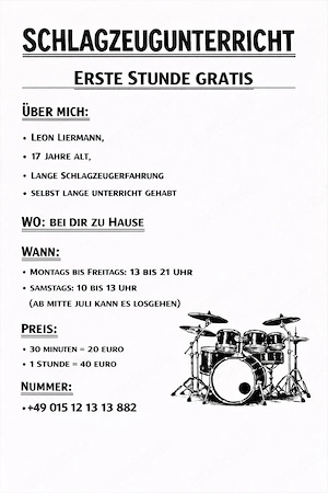 Mein Name ist Leon Liermann und ich gebe Privaten Schlagzeugunterricht. Nach den Sommer Ferien auch Hauptberuflich. Ich bin 17 Jahre alt und spiele seitdem ich 3 Jahre alt bin. Der Unterricht richtet sich an begeisterte Erwachsene die Schlagzeug lernen wollen. Im Umkreis von 30 km komm ich zu dir nach ...