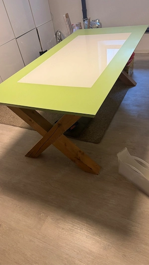 Verkaufen aufgrund von Platzmangel unseren massiven Schreibtisch mit weißer Glasplatte. Maße: 200x100xH70cm ( Platte ist 3,5 cm dick) Der Zustand ist leicht gebraucht. Neupreis war 1000,00