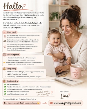 Hallo, ich betreibe ein etabliertes Einzelhandelsgeschäft im Bereich hochwertiger Küchengeräte und suche aktuell zuverlässige Unterstützung im Online-Verkauf. Die Tätigkeit ist flexibel als Minijob, Teilzeit oder Vollzeit möglich bequem von zu Hause aus, auch per Smartphone. Über mich Ich bin Lina ...
