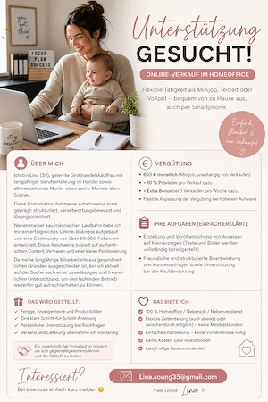 Hallo, ich betreibe ein etabliertes Einzelhandelsgeschäft im Bereich hochwertiger Küchengeräte und suche aktuell zuverlässige Unterstützung im Online-Verkauf. Die Tätigkeit ist flexibel als Minijob, Teilzeit oder Vollzeit möglich bequem von zu Hause aus, auch per Smartphone. Über mich Ich bin Lina ...