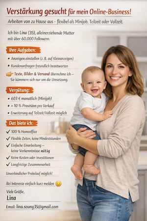 Hallo, Einzelhandelsgeschäft sucht Unterstützung im Online-Verkauf. Möchten Sie ein regelmäßiges Einkommen aufbauen flexibel von zu Hause aus? Wenn Sie Interesse an einer flexiblen Tätigkeit von zu Hause aus haben, könnte diese Aufgabe passend für Sie sein. Diese Tätigkeit eignet sich auch für ...