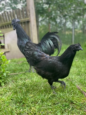 Ich biete vier reinrassige Ayam Cemani Hähne von Ende 2024 an. Preis pro Tier