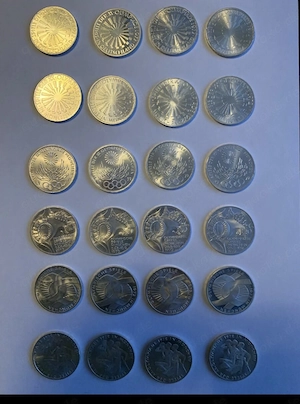 Ich verkaufe eine Sammlung von 24 deutschen 10-DM Silber-Gedenkmünzen zu den Olympischen Spielen 1972 in München. Die Münzen zeigen verschiedene Olympia-Motive und sind jeweils mit unterschiedlichen Prägebuchstaben (A, D, F, G, J) vorhanden. Details: 24 Münzen 10 DM Olympische Spiele München ...