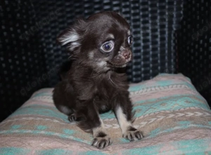 Unsere wunderschönen Chihuahuawelpen dürfen ausziehen und suchen ab sofort ein schönes neues Zuhause. Alle Welpen sind langhaar. Die Welpen auf dem grün-bunten Kissen sind die Rüden in schoko (sehr zierlich), schwarz und schoko-merle. Die Hündinnen in schwarz, schoko-merle und black-merle sind auf ...