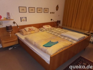 Gut erhaltenes, sehr komfortables Doppelbett aus den späten 50 Jahren mit integierten Nachttischen und jüngeren gepflegten Matratzen noch im Januar abzugeben. Maße: Kopfende 3,18m incl. Nachttische, Fußende 2,05m, Bettlänge 2,15m, Liegefläche 1mx2m. Man schläft darauf wirklich sehr gut!