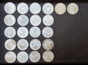 Ich verkaufe eine Sammlung von 24 deutschen 10-DM Silber-Gedenkmünzen zu den Olympischen Spielen 1972 in München. Die Münzen zeigen verschiedene Olympia-Motive und sind jeweils mit unterschiedlichen Prägebuchstaben (A, D, F, G, J) vorhanden. Details: 24 Münzen 10 DM Olympische Spiele München ...