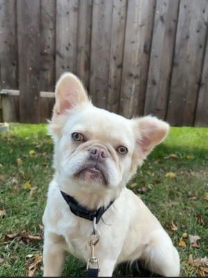 Whitey, 1-jährige freundliche Fluffy French-Bulldoggen-Mischlingshündin, sucht ein verantwortungsvolles neues Zuhause.