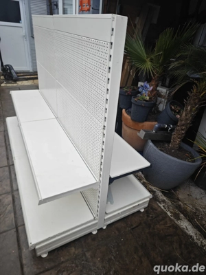 Hallo zum Verkauf steht hier ein verkaufsregal der Firma tego Metall ladeneinrichtung Das verkaufsregal gondelregal besteht aus 2x1 Meter Regal mit jeweils 2 regalböden von beiden Seiten Und den unteren einlegeboden Der obere Teil dieser Gondel ist für lochhaken bestimmt um ganz einfach Gegenstände ...