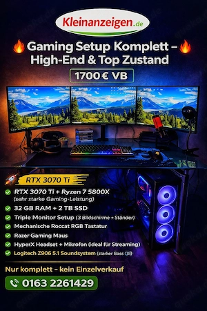 Verkaufe komplettes Gaming-Setup in einwandfreiem Zustand, nur zum Gaming genutzt. Perfekt für Gaming, Streaming und Multimedia. PC: AMD Ryzen 7 5800X 8-Core Processor NVIDIA RTX 3070 Ti 8GB 32GB DDR4 RAM MSI MPG B550 Gaming Plus 2 TB SSD Harkoon Gehäuse Peripherie: Mechanische Tastatur Roccat ...