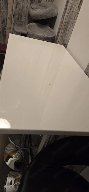 Hallo zusammen. Verkaufe eine ess-gruppe mit Barhockers in Hochglanz weiß tisch und sehr dunkelbraune fast schwarze Hockers. Es sind normale Gebrauchsspuren, die man kaum sehen kann drauf außer ein kleinen Brandflick. 60 euro vb