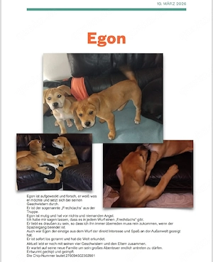 liebe Interessenten, Der kleine Egon sucht noch eine passende Familie! Er ist am 19.12.2025 geboren er ist ein Akitaino Mischling, beide Elternteile sind vor Ort und er ist vollständig geimpft, Gechipt und Entwurmt, Abholbereit ist der kleine Egon auch. bei weiteren Fragen oder Interesse gerne melden ...