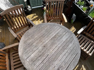Ich biete ein gut gebrauchtes Gartentisch-Set aus Teakholz an. Es besteht aus einem Tisch und vier passenden Stühlen. Bitte nur Abholung in 52391 Vettweiß. Keine Garantie und vom Umtausch ausgeschlossen