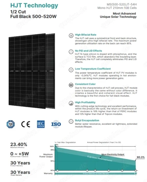 Maysun Solar HJT Solarmodul Full Black 500W 520W Bifazial Leistung: 500w 505w 510w 515w 520w Wirkungsgrad: 22.5%-23.4% Abmessungen (L B H): 1960mm 1134mm 30mm Gewicht:27.1 kg Verpackungen: 36 Stücke Palette, 864 pcs 40H Garantie: Produkt- und Leistungsgarantie von 30 Jahren