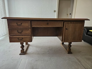 Verkaufe einen Schreibtisch aus Vollholz Der Tisch ist sehr schwer, es braucht mindestens 2 Personen zum Tragen, steht im 1. OG Maße: 160cm breit, 72cm tief, 77cm hoch Guter Zustand mit leichten Gebrauchsspuren überwiegend in den Schubladen Füße können für den Transport abmontiert werden