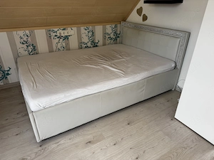 Hallo, ich verkaufe hier dieses moderne Einzelbett inklusive Rost und Matratze in der Größe 140x200 in weißem Kunstleder mit Strass an der Kopflehne. Das Bett ist außer den Mängeln (siehe Bild) in einem guten Zustand und ideal für ein Kinder-, Jugend- oder Gästezimmer. Haustier- und rauchfreier Haushalt. Bei ...