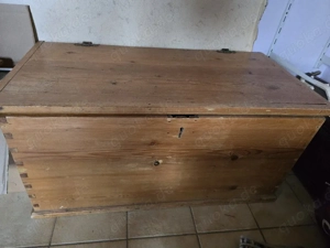 Bei dem abgebildeten Möbelstück handelt es sich um eine klassische, aus Holz gefertigte Aufbewahrungstruhe, die häufig im antiken oder Vintage-Stil (oft aus Weichholz wie Kiefer) anzutreffen ist. Solche Truhen dienen vielseitig als Möbel zur Aufbewahrung, beispielsweise für Decken oder als dekoratives ...