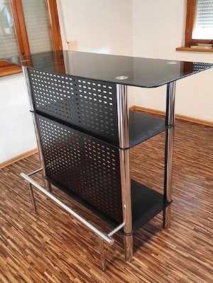 Angeboten wird eine gepflegte schwarz- silberfarbene Empfangstheke mit schwarzer Glasplatte, die bisher in einem Friseursalon oder genutzt wurde. Vielseitig einsetzbar im privaten Haushalt, in Beauty-Studios etc. Maße: 108 cm hoch, 130 cm breit, 51 cm tief