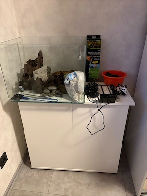 Verkaufe mein komplettes 75-Liter Aquarium-Set mit allem was dazu gehört. Das Panorama-Glasaquarium steht auf einem praktischen weißen Unterschrank mit Stauraum. 75 Liter Glasaquarium mit Panoramascheibe Weißer Unterschrank mit Türen Bodengrund bereits enthalten Natürliche Mangrovenholz-Dekoration ...