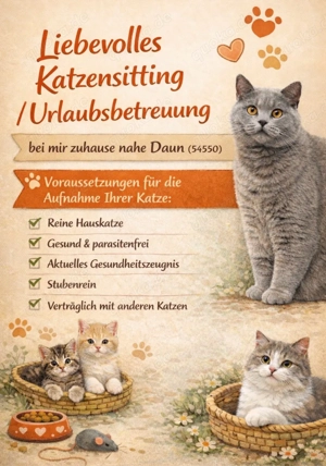 Hallo Ihr Lieben Katzenfreunde :) Ich biete liebevolle Katzenbetreuung bei uns Zuhause an (nahe 54550 Daun). Seit über 20 Jahren bin ich mit verschiedenen Katzenrassen und Mischlingen aufgewachsen, habe Erfahrung mit schwangeren Katzen, deren Geburt und auch mit der Aufzucht der Kitten. Außerdem habe ...