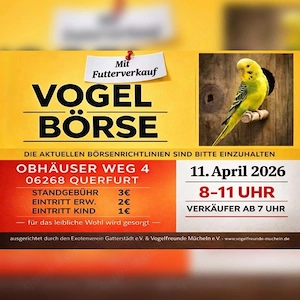 Unsere gut besuchte Vogelbörse Querfurt ist wieder am 11.04.2026. Mit Futterverkauf Für das Leibliche Wohl ist Gesorgt