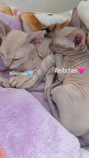 Unsere süßen Don Sphynx Kitten sind jetzt 5 Wochen alt eine Weibchen und eine Männchen (Geschwister) die spielen gerne miteinander und entwickeln sich prächtig. Die kleinen sind verspielt, neugierig und sehr menschenbezogen typisch für diese besondere und liebevolle Rasse. Die Kitten wachsen bei uns ...