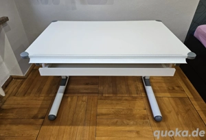 Abzugeben ist ein toller Schreibtisch. Er ist höhenverstellbar, hat ein Schubfach unter der Tischplatte und diese kann auch angekippt werden. Maße: ca.110 x ca. 73. Bild 4 sieht man einen kleinen Kleberest. Nur an Selbstabholer, keine Garantie oder Rücknahme