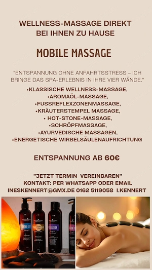 Die mobile Massage bringt wohltuende Entspannung direkt zu Ihnen nach Hause oder ins Büro. So genießen Sie eine professionelle Massage in Ihrer vertrauten Umgebung ohne Stress und ohne zusätzlichen Zeitaufwand. In ruhiger Atmosphäre können Sie loslassen, abschalten und neue Energie tanken. Jede Behandlung ...
