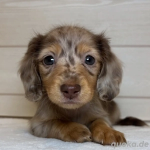 Unsere reinrassigen Zwergdackel Welpen in black merle, blue merle und black Tan dürfen bald in ein neues zu Hause umziehen. Es sind 3 Mädchen und ein Rüde (siehe Bild 5). Sie sind am 14.09. geboren und bei Abgabe geimpft und entwurmt. Ein kleines Starterpaket gibt es ebenfalls mit in das neue zu Hause. ...