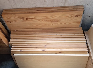 vermutlich IKEA, Abmessungen 30 x 80 cm (4 St), 30 x 84 cm (9 St), 50 x 85 cm (5 St). Dazu gibt es etliche Metallstifte zum Befestigen und 4 verschiedene Seitenteile (s. dort). Die Bretter können auch einzeln gekauft werden, daher ist der Preis Absprachesache.