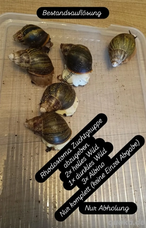 Hallo wegen Bestandsauflösung steht diese Archachatina Rhodostoma Zuchtgruppe zur Abgabe. 2 helles Wild 1 dunkles Wild 3 Albino alle 6 Tiere sind Adult und zwischen 1 1 2-3 jahre Abgabe erfolgt nur zusammen aller 6 Tiere keine Einzel Abgabe! kein Versand!!! nur Abholung keine Geschütze ...