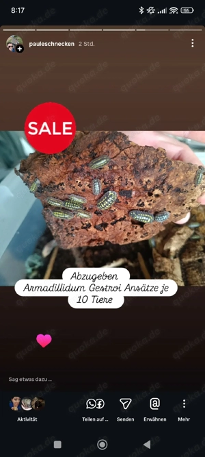 Hallo Ich gebe aktuell noch paar Zuchtansätze von meinen Armadillidum Gestroi ab. aktuell 2-3 Ansätze verfügbar ( Größen sind von klein bis mittelgroße Tiere) je Ansatz sind 10 Tiere enthalten alles weitere per Nachricht
