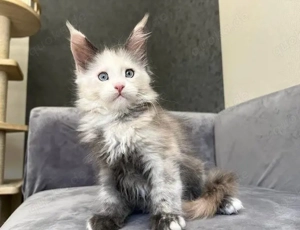 Maine-Coon-Kätzchen zu verkaufen Dreifarbiges Maine-Coon-Kitten mit blauen Augen, typischen Ohrpinseln und sehr flauschigem Fell. Verspielt, aufmerksam und gesund ideal als Familien- oder Liebhabertier.