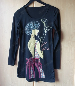 keine Tragefotos ! bitte nachmessen, da kein Größenetikett ! Shirt, Longshirt, könnte auch ein Minikleid sein, schwarz bunt, viele bunte Steinchen, kein Größenetikett vorhanden, evtl. Einheitsgröße, ca. Gr. XS S bzw. ca. Gr. 34 36, seitlich unten am Abschluß kleine Gummizüge, die nur noch wenig elastisch ...