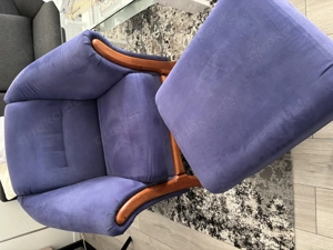 blauer Sessel, mit dazugehörigem Hocker, Stoffbezug intakt und fleckenlos, pflegeleicht und gut abwaschbar. kirschbaumfarbenfarbene Füße und Applikationen an der Vorderseite des Sessels, mit Gebrauchsspuren da circa 20 Jahre alt, auf den Fotos zu sehen nur an Selbstabholer abzugeben, keine Garantie keine ...