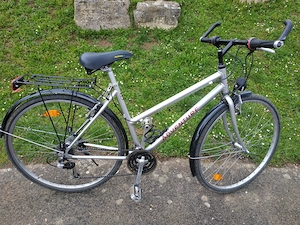 Das Fahrrad ist in gutem Zustand. Die Reifen (26 Zoll) sind aufgepumpt, die 21-Gang-Schaltung funktioniert und die Bremsen sind intakt. Das Fahrrad ist mit Schutzblechen, Gepäckträger und Korb ausgestattet. Zusätzliches Zubehör wie Licht, Pumpe und Schloss kann separat erworben werden. Natürlich weist ...