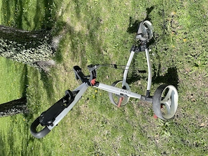 Big Max Blade Golf Caddy Alu Klappbar Golf Trolley in weiß mit Gebrauchsspuren, ein Plastikschieber unten hat einen Sprung ist mir gerade aufgefallen, ( letztes Bild) hat aber auf die Funktion keine Auswirkungen, da es ein Markengerät ist könnte man es bei Bedarf sicher ersetzen, sonst sehr praktisch ...