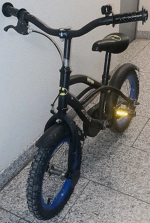 Cooles Batman-Kinderfahrrad in 14 Zoll in schwarzem Design mit blauen Felgen und auffälligen Batman-Logos. Ausgestattet mit sicherem, geschlossenem Kettenschutz sowie Hand- und Rücktrittbremse bietet es optimale Kontrolle und Fahrspaß für kleine Superhelden.