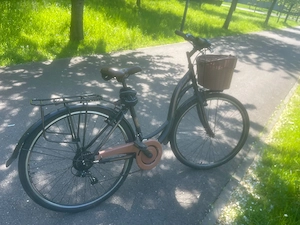 Das Fahrrad ist in gutem Zustand. Die Reifen (26 Zoll) sind aufgepumpt, die 21-Gang-Schaltung funktioniert und die Bremsen sind intakt. Das Fahrrad ist mit Schutzblechen, Gepäckträger und Korb ausgestattet. Zusätzliches Zubehör wie Licht, Pumpe und Schloss kann separat erworben werden. Natürlich weist ...