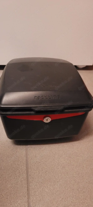 Abschließbarer Fahrradkoffer zur festen Montage auf dem Gepäckträger. Befestigungsmaterial komplett dabei. Maße ca. 40x30x20 cm.