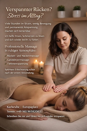 Professionelle Massage für schnelle Entspannung und spürbare Erleichterung. Rücken-, Nacken- und Ganzkörpermassage Karlsruhe Europaplatz Jetzt Termin sichern.