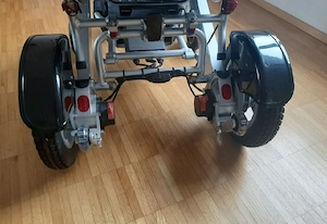 Ca. Maße in cm: Sitzbreite: 44, Sitzhöhe: 53, Sitztiefe: 45, Breite: 63, Breite zusammengeklappt: 33, Höhe: 83, Länge mit Fußrasten: 92, Länge ohne Fußrasten: 81, Gewicht: ca. 16 kg