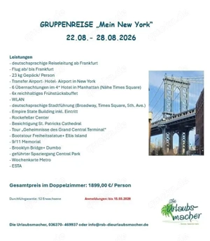 Kommen Sie mit auf eine unserer Gruppenreisen New York 22.08.- 28.08.2026 Michigan Rundreise inkl. Chicago 16.09.- 25.09.2026 Flusskreuzfahrt Donau 28.11.- Die detaillierte Reisebeschreibung inkl. Preise siehe Bilder. Jede Reise wird von mir persönlich begleitet. Kontaktieren Sie uns bei Frag ...